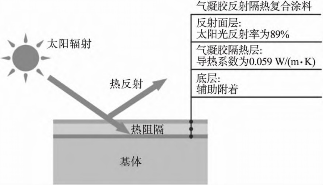新型氣凝膠反射隔熱涂料以二氧化鈦、二氧化硅氣凝膠粉末為太陽反射層填料,二氧化硅氣凝膠和空心玻璃微珠為隔熱層填料制備而成,為增強反射隔熱涂料與建筑墻體附著效果,涂料底層采用水溶性環(huán)氧樹脂膠。氣凝膠反射隔熱涂料在建筑外墻的涂覆過程包括:首先,噴涂環(huán)氧樹脂膠底層;然后,涂覆氣凝膠隔熱層(厚度2 mm) ;最后,晾干后噴涂反射面層,其反射隔熱機理及構成如圖下所示。